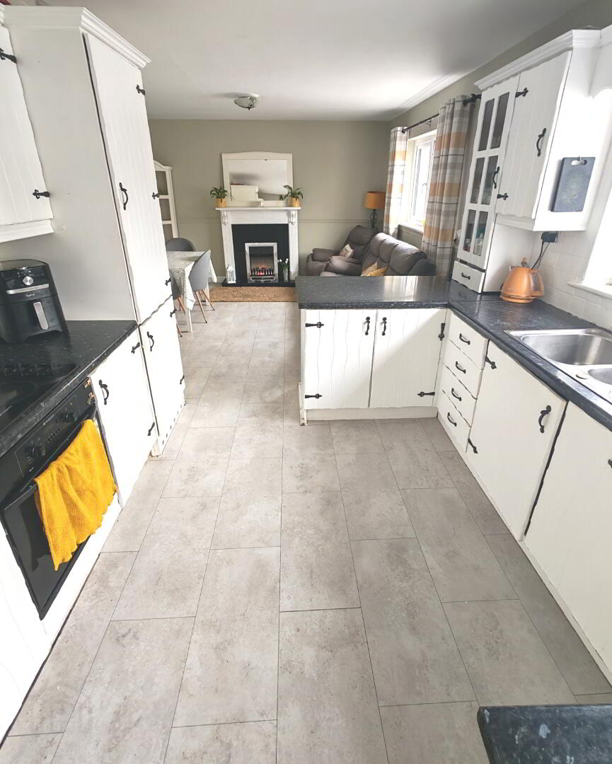 Laminate floor, fully fitted floor & wall units, integrated fridge / freezer unit, integrated electric hob & oven with overhead extractor fan, integrated dishwasher, 1½ tub stainless steel sink unit