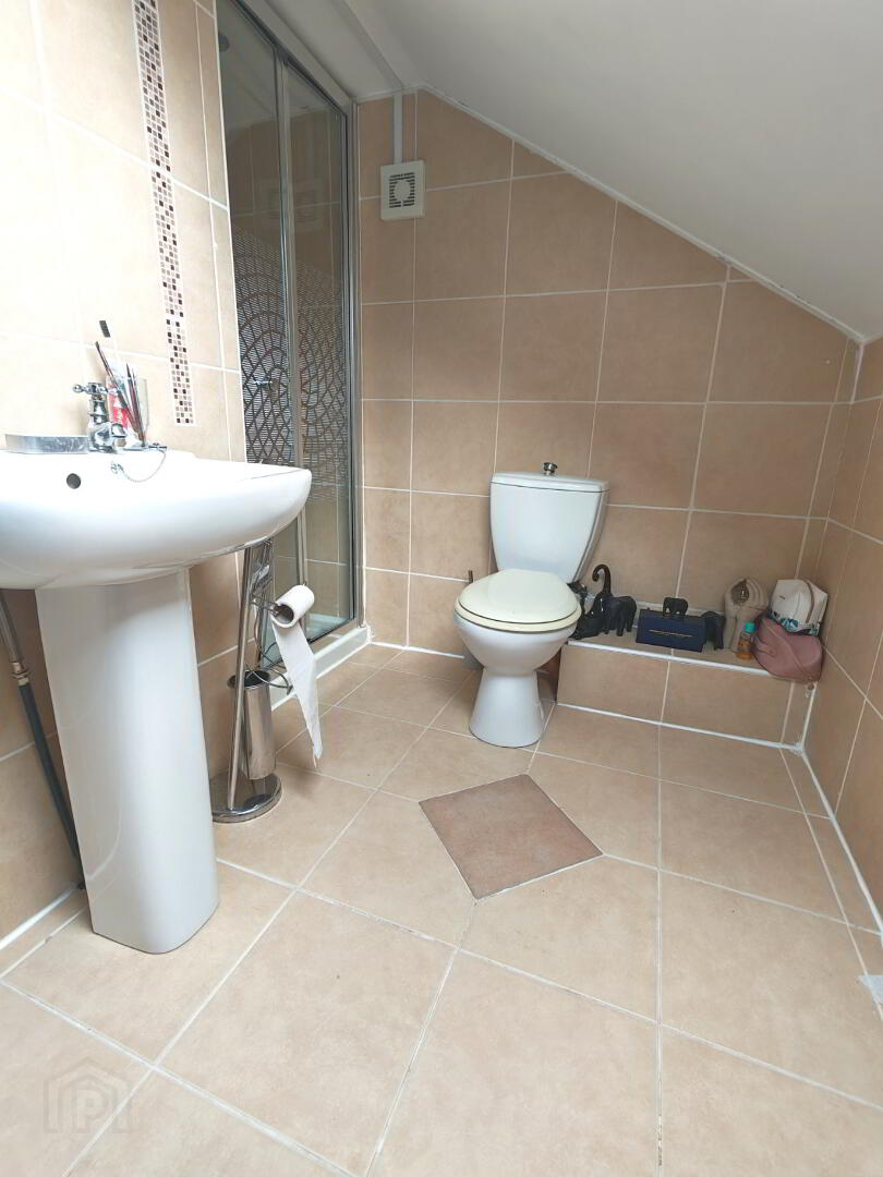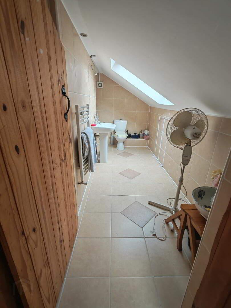 Fully tiled floor & walls, wc & wash hand basin in white suite, Triton T80z electric shower, heated towel rail