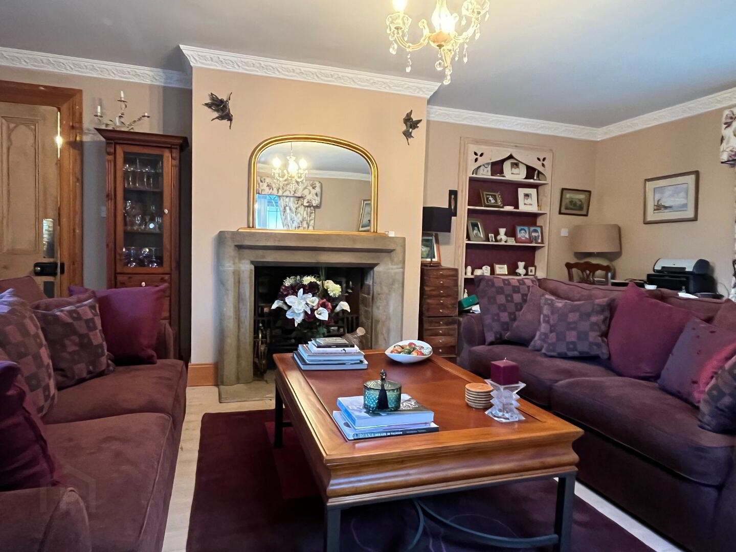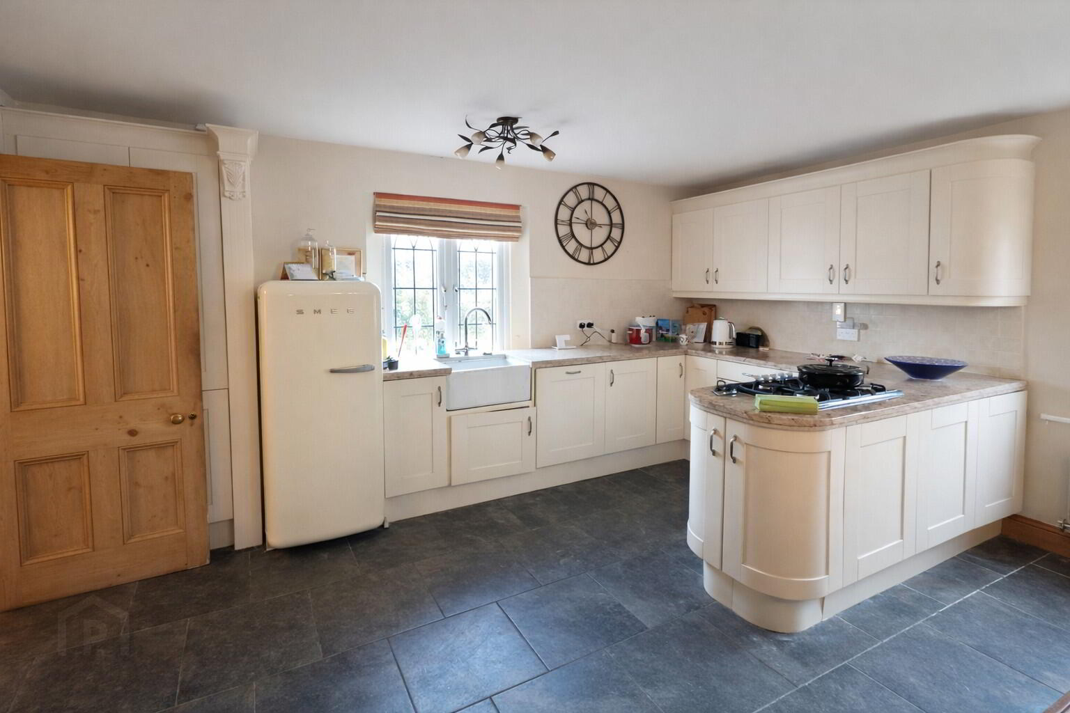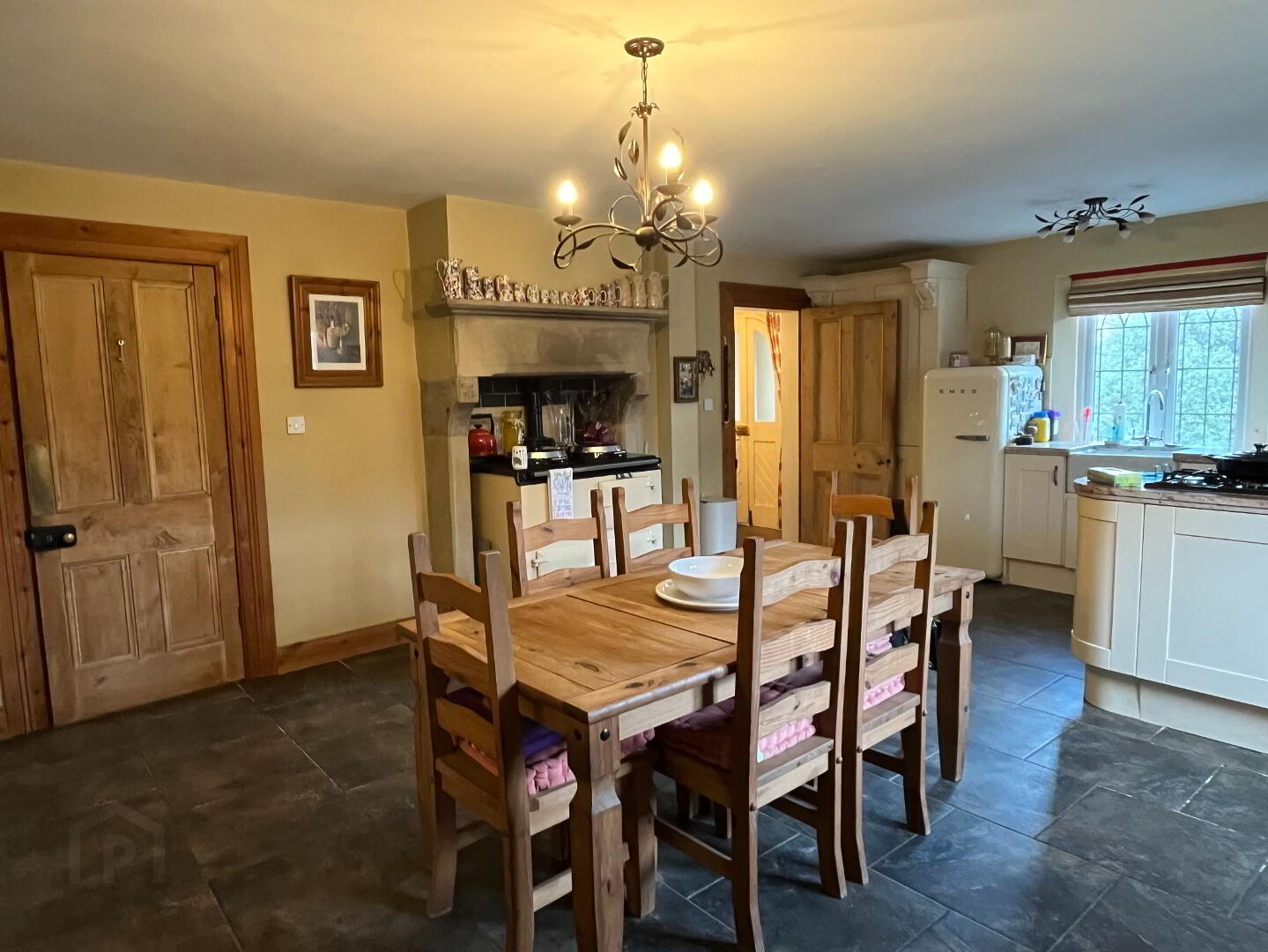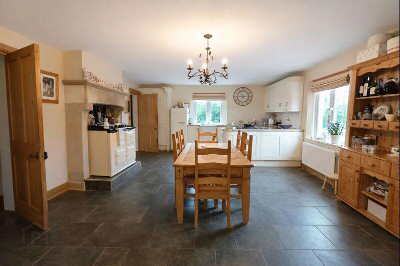 Tiled floor, modern style floor & wall units, granite worktop, Belfast sink, electric oven with 5-ring gas hob, built in larder unit, Oil-fired AGA Cooker with stone surround fireplace