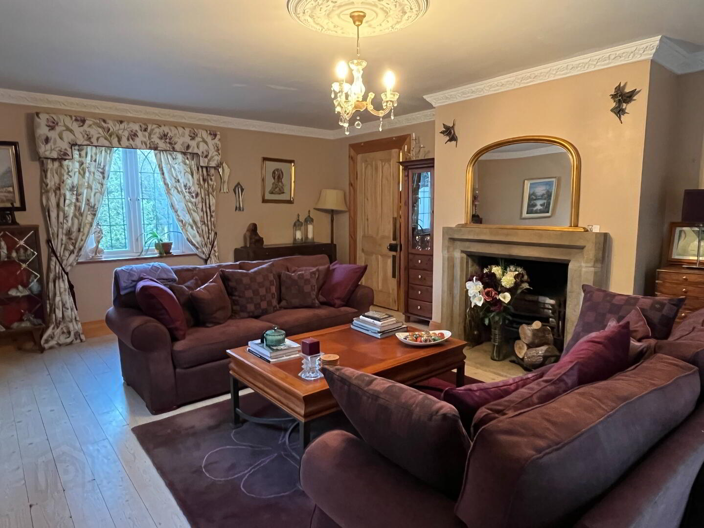 Exposed timber floor, attractive stone & brick open fireplace on flagstone hearth, cornice molding to ceiling & centrepiece, patio doors to back, triple aspect windows