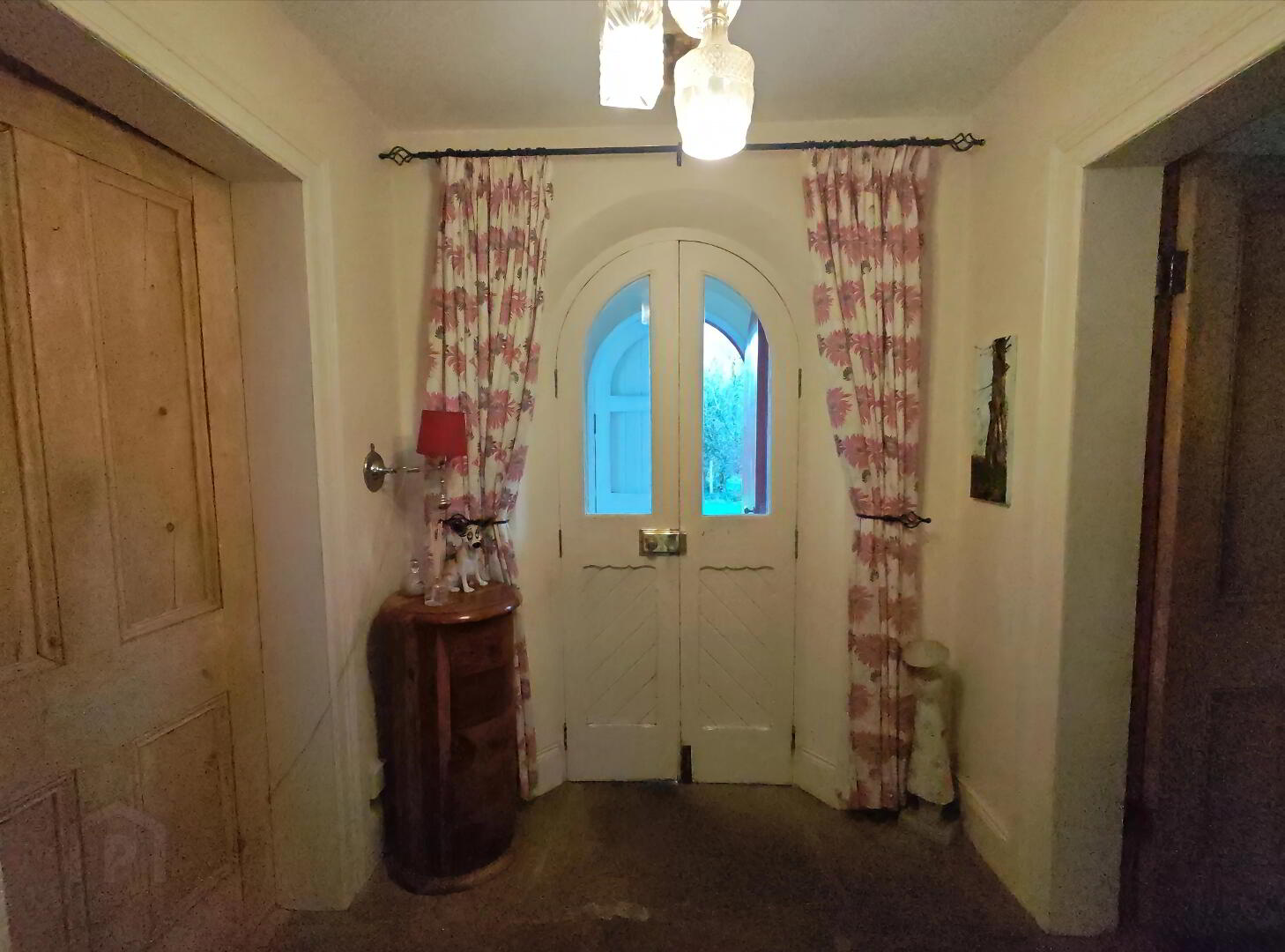 Arched Tudor style entrance doors, flagstone floor