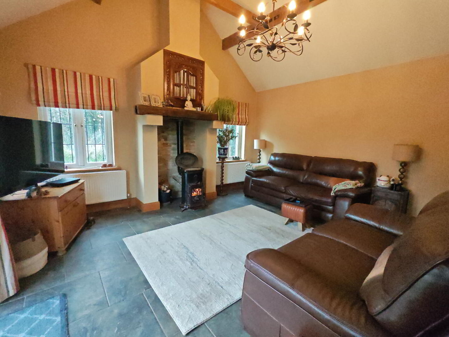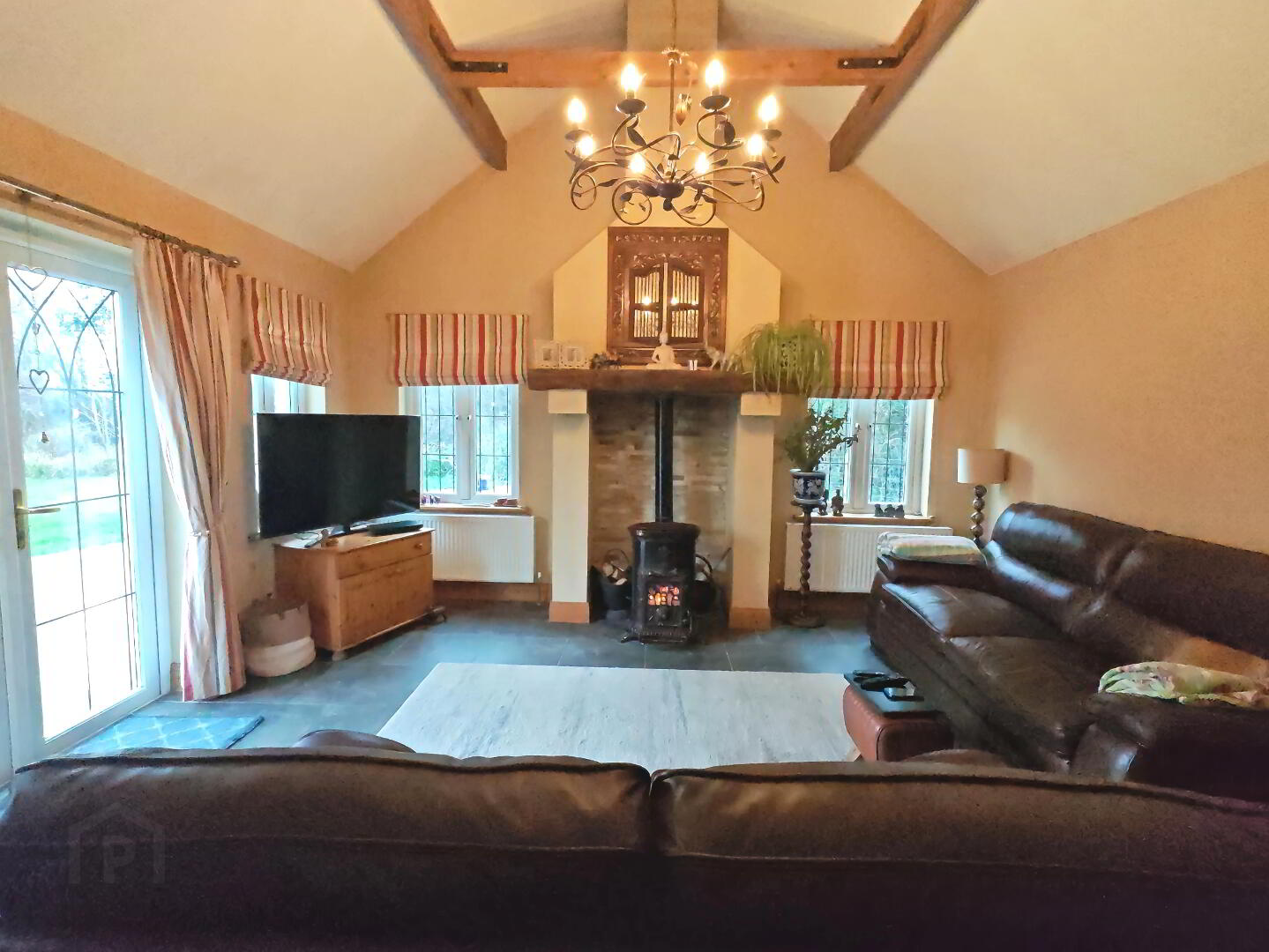 Tiled floor, solid fuel French-style stove with stone clad fireplace and timber mantle, vaulted ceiling with timber beams, double aspect windows, double doors to side